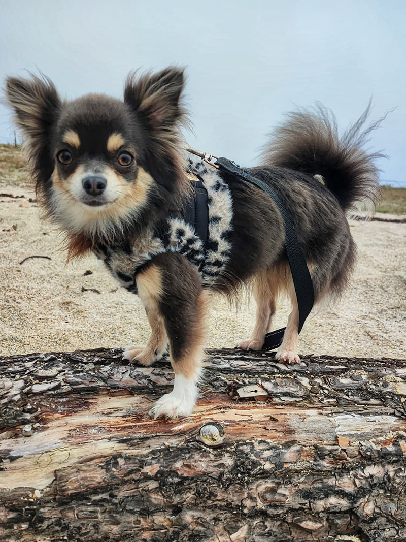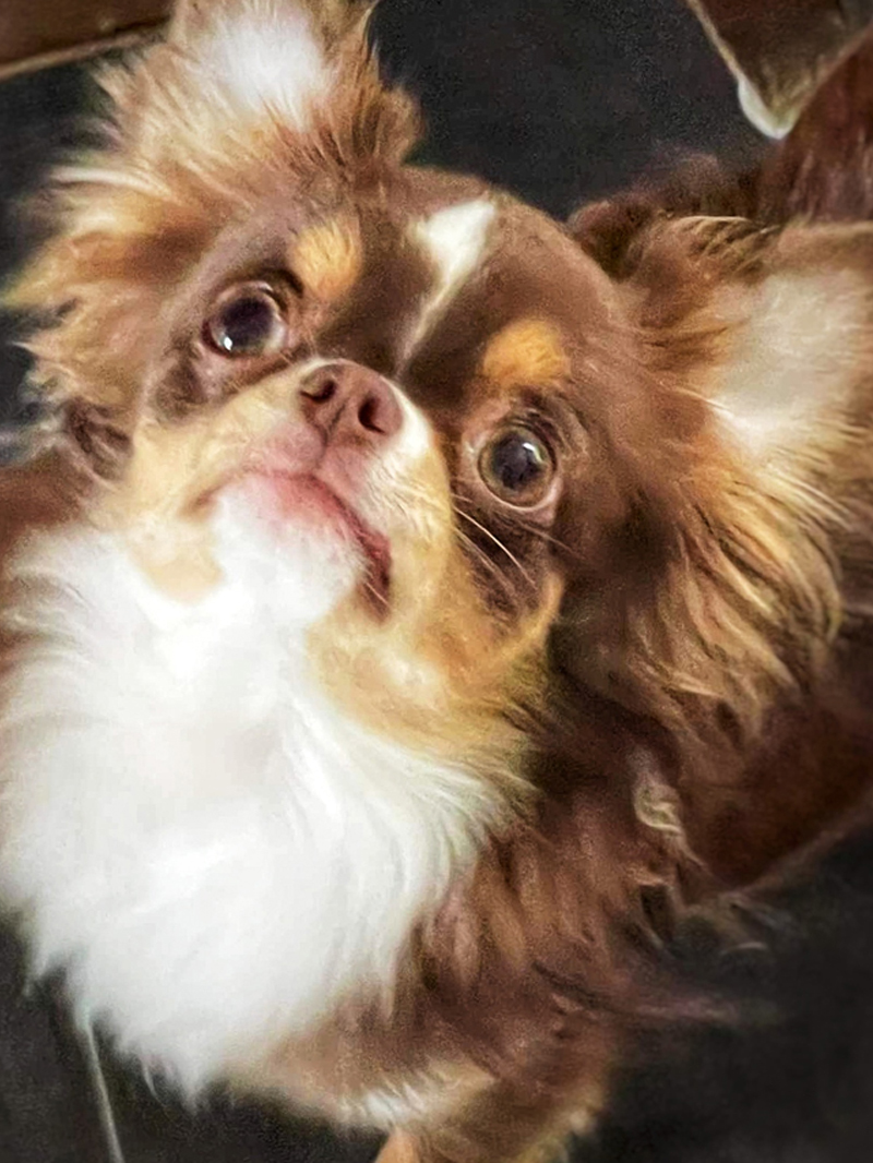 Quatre joyaux aux reflets de soie, symboles parfaits de la douceur et de la malice propres au Chihuahua à poil long.
