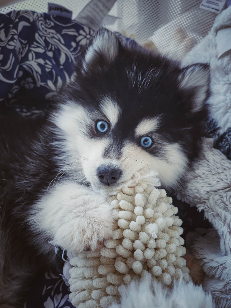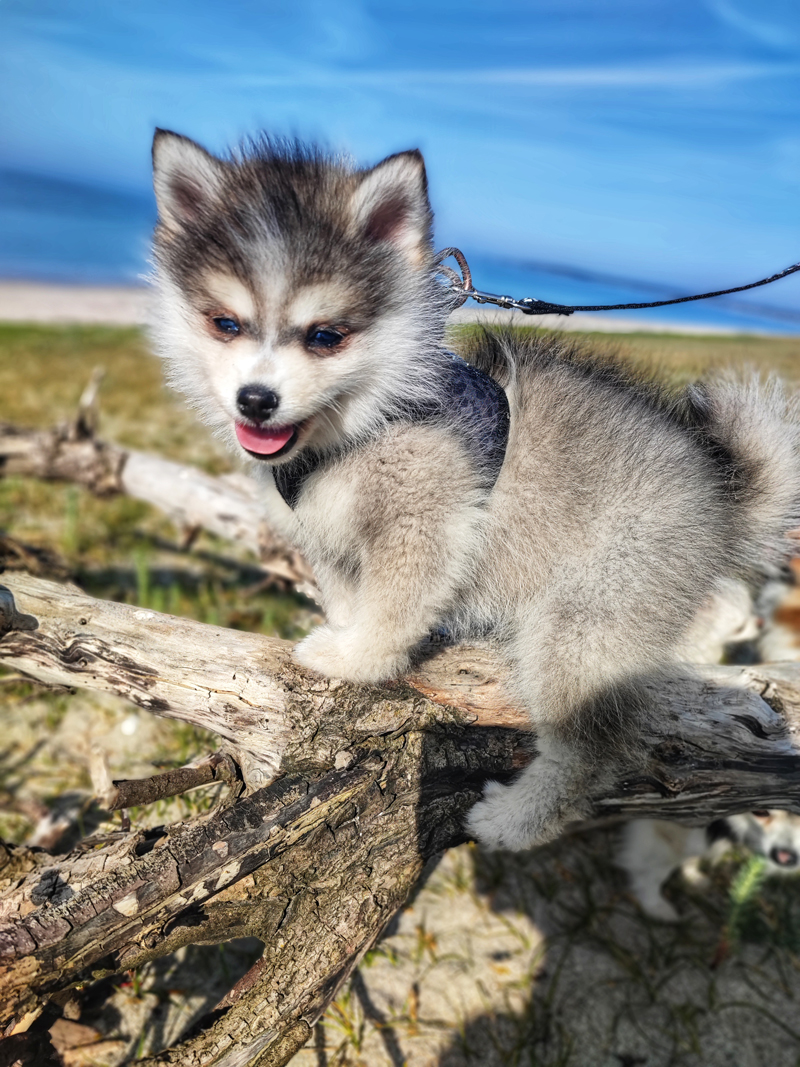 Notre magnifique Athéna, Pomsky F3, est une femelle rare au charme irrésistible. Son marquage husky noir et blanc, son poil fluffy et ses yeux expressifs font d’elle une petite reine au cœur tendre.